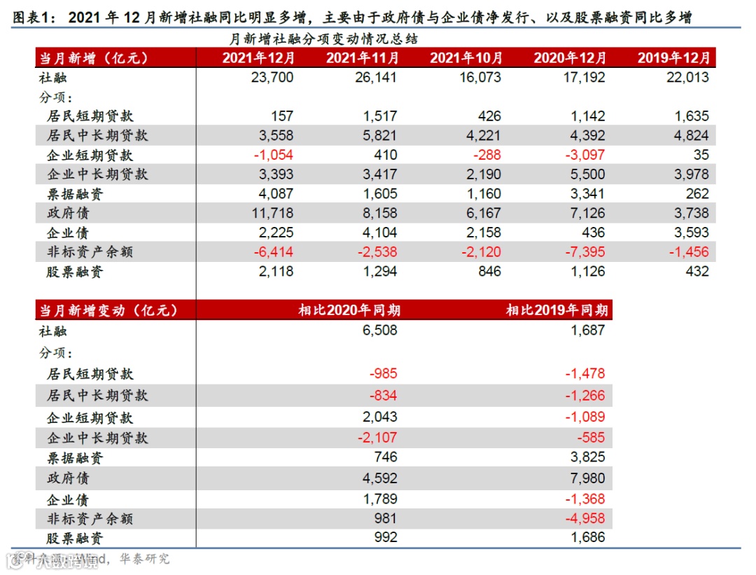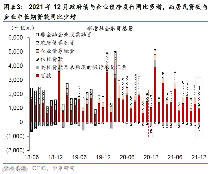 2) 2021年12月新增社融为2.37万亿元,小幅低于彭博一致预测的2.4万亿元、但高于2020年同期的1.72万亿元以及2019年12月的2.2万亿元。从贷款以外的分项看(图表3),2021年12月信托贷款、委托贷款与银行未贴现承兑汇票等“非标”资产合计余额环比下降6,414亿元,降幅较2021年11月的2,538亿元明显走扩、但不及2020年12月的7,395亿元。另一方面,12月企业债净融资为2,225亿元,明显高于2020年同期的436亿元、但低于2019年12月的3,593亿元。同时,12月政府债净发行1.17万亿元,大幅高于2020年同期的7,126亿元、以及2019年12月的3,738亿元。
