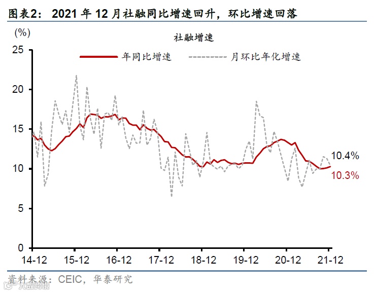 2021年12月与基建相关的政府债及企业债融资同比多增,推动社融同比增长微升。但另一方面,地产相关融资(包括开发贷、非标融资、甚至房贷)继续偏弱,显示地产相关的逆周期政策的力度和协调性均有待加强。同时,内需继续走弱继续拖累企业自发贷款意愿。具体看,2021年12月新增人民币贷款与新增社融均不及市场预期,而M2同比增速略超市场预期——低基数下,12月社融存量同比增速从11月的10.1%进一步小幅回升至10.3%,而季调后月环比折年增速从11月的11.5%小幅放缓至10.4%、仍然“不温不火”(图表1和2)。12月新增社融为2.37万亿元,小幅低于彭博一致预期的2.4万亿元,但明显高于2020年同期的1.72万亿元。12月新增人民币贷款为1.13万亿元,低于彭博一致预期的1.25万亿元,反映经济自身融资需求仍偏弱、稳增长政策力度不足。12月M2同比增速从11月的8.5%明显回升至9.0%,高于彭博一致预期的8.6%,同时M1增长小幅回升。分项看,12月新增社融同比明显多增,主要由于政府债与企业债净发行、以及股票融资同比多增,而非标资产降幅同比收窄。另一方面,居民贷款与企业中长期贷款同比少增。