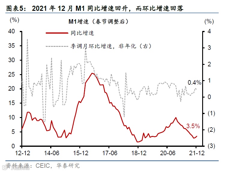 3) 2021年12月M2同比增速从11月的8.5%回升至9.0%,高于彭博一致预期的8.6%(图表4)。经季节性调整后,12月M2月环比(非年化)增速从11月的0.6%回升至0.9%。12月财政存款环比下降1.03万亿元,同比多减762亿元,边际提振M2增速。由此,12月财政存款同比增速从11月的11.8%小幅回升至12.6%。2021年12月M1同比增速从11月的3.0%回升至3.5%,而环比(非年化)增速从11月的0.5%微降至0.4%(图表5)。