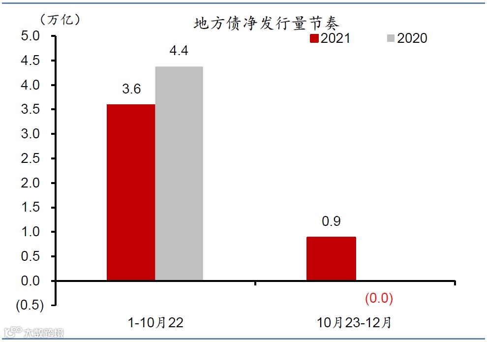 9月财政数据显示总需求放缓下财政宽松缺乏着力点。经济下行的负反馈信号已经产生,内需放缓、限电限产、成本上涨,以及15号文对基建投资的制约均可能导致财政支出缺乏着力点、宽松力度再度减弱。财政部周五表示,下一步将继续加强对地方的指导,围绕国家重大区域发展战略以及十四五发展规划,加大对重点项目支持力度,2021年新增专项债额度尽量在11月底前发行完毕。以此推断,11月底前将净发行约8,800亿地方债,相比8-9月平均净发行近5000亿略有加快(图表9)。但是,考虑到地方财政吃紧、今年有将近一半的地方债用途为“借新还旧”,支出发力和资金落实至投资端可能更为关键;同时,财政、货币及监管政策需配合宽松,以实现“托底”效果。