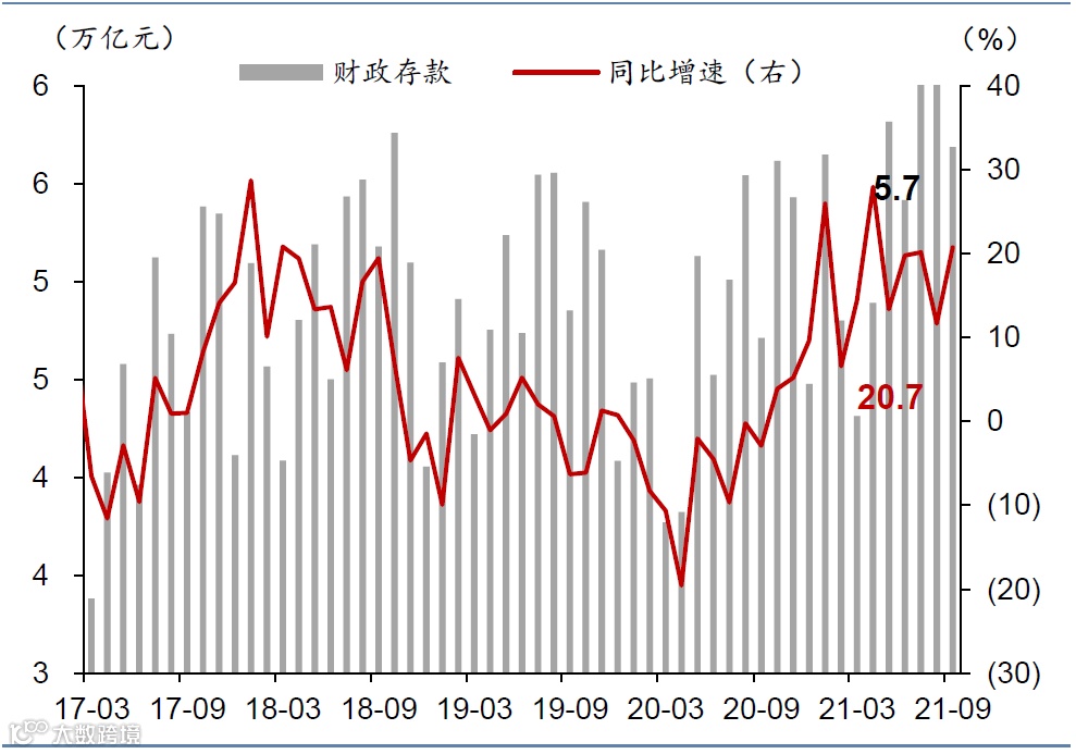 2021年9月财政赤字扩张力度再度走弱——财政收入和支出增速双双放缓,总需求下行财政扩张亦“有心无力”。汇总一般公共预算赤字及政府性基金赤字,9月广义财政赤字录得1.48万亿元,不及去年9月的1.72万亿元(图表1、2和10)。累计来看,1-9月广义财政赤字为2.56万亿元,较去年同期缩减3.16万亿元。此外,9月末财政存款减少5,018亿元至5.7万亿元,但同比增速从上月的11.7%加快至20.7%(图表5)。