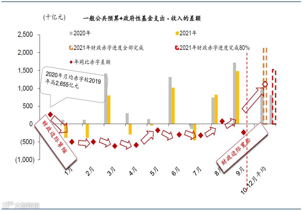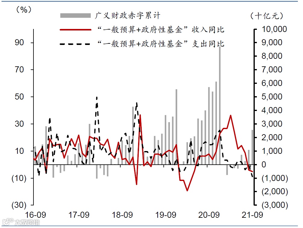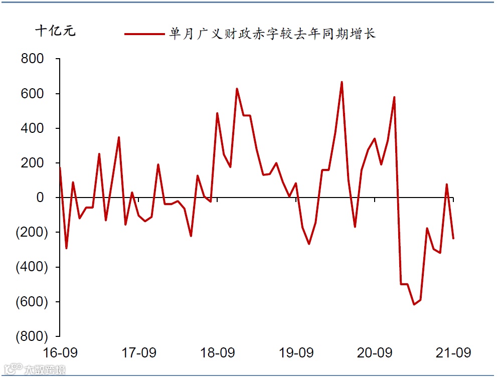 图表2:1-9月广义财政赤字录得2.56万亿元,较去年同期收缩3.16万亿元