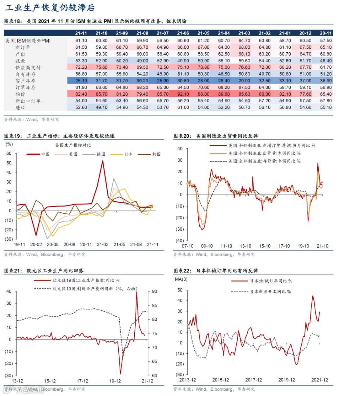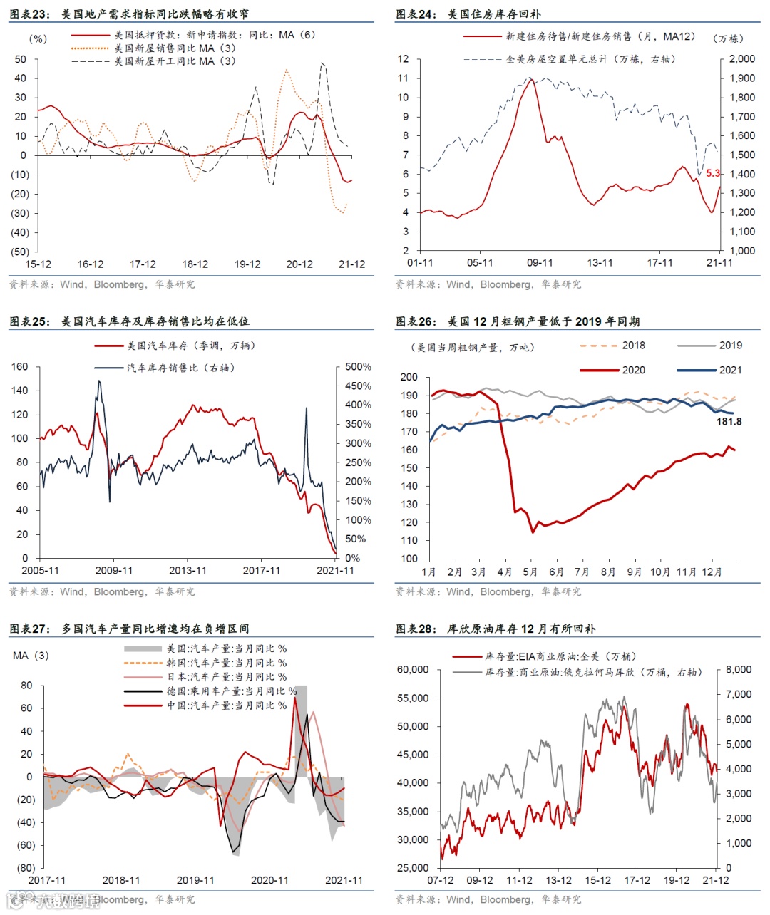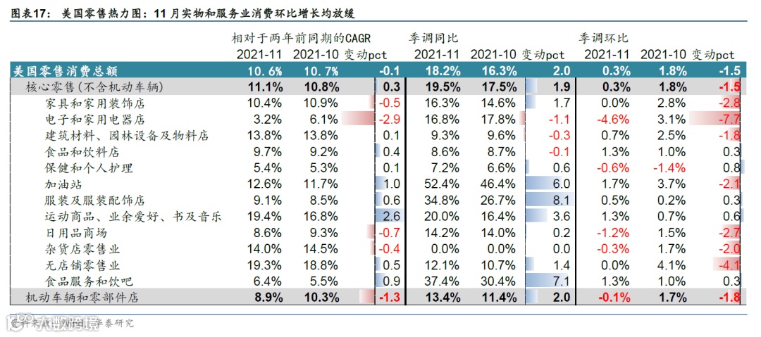 先行指标方面,美/英/欧制造业及服务业景气度均回落、服务业受Omicron影响降幅较大。英国受冲击最明显,美国受影响幅度相对小。美国11月Markit制造业和服务业PMI均回落0.5pct;英国制造业PMI回落(-0.5pct)、服务业回落幅度大(-5.3pct)。欧元区制造业PMI小幅回落(-0.4pct)、服务业同样回落幅度更大(-2.6pct)。供给瓶颈边际改善,但供不应求局面仍存,且高通胀影响居民购买力。美国11月零售消费环比+0.3%、前值+1.8%;实物及服务业消费环比增长均减速。地产方面,美国11月新屋开工同比增长连续第6个月减速,但新屋销售及MBS申领同比跌幅也收窄,库存/销售比继续回升。