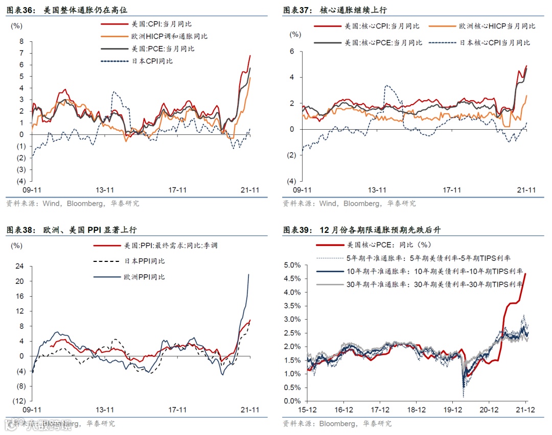 2021年12月份,Omicron对欧洲的影响大于美国,欧美服务业承压。通胀压力短期仍较高,但通胀指标“超预期”的幅度有所回落。供给瓶颈边际缓解和补库需求推升生产增速。联储加快退出QE。美联储加速taper,美元指数维持强势;欧美疫情大幅回升,但欧洲局势较美国更紧张、服务业受影响更大。油价及美债长端名义利率在月初下跌后,情绪逐渐缓和、有所回升。截至12月末,TIPS隐含美国通胀预期基本持平11月末。