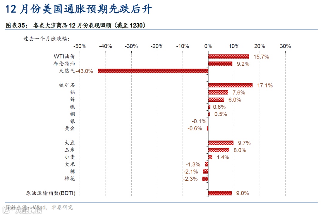 通胀压力短期仍较高,但超预期涨价商品数量及种类均有所下降,通胀压力更为“集中”、“光谱”收窄。美国11月CPI环比+0.8%(前值0.9%)、11月核心PCE环比+0.5%(前值0.5%),机动车价格涨幅收窄;娱乐餐饮涨价动能有限;房租涨幅稳定。下游生产回升、芯片需求扩大,12月份,4GB DRAM芯片均价反弹1.4%(此前三个月平均下跌4%)。以当月均价计,截至12月31日,12月WTI油价较11月下跌8.9%(若以时点价格计,12月末油价已较11月末有所回升)。BDI海运指数整月下跌27%,但宁波出口运价指数上涨4.2%、往东南亚出口运价涨幅更大。12月份,5/10年期通胀预期先跌后升,截至12月末,基本持平Omicron公告前(11月末)的水平。