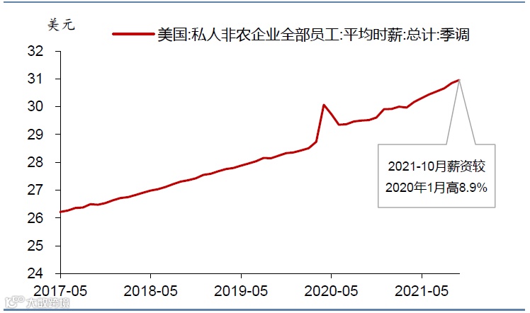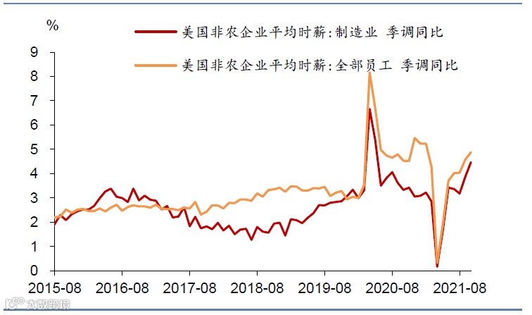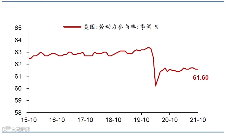 10月非农时薪环比+0.4%、持平彭博一致预期。今年二季度以来,非农时薪累计增幅较大、较一季度加快,助长了通胀预期——4-10月非农薪资连续7个月正增长、月均环比增速接近0.5%,Q2季度折年增速6.4%,而7-10月折年增速也达到5.2%。劳动参与率改善滞后、而薪资水平继续走高,说明就业市场仍“供不应求”——10月份,运输仓储、休闲酒店业薪资环比涨幅均达到1%、较前值(9月环比涨幅)的增幅相对最大。
