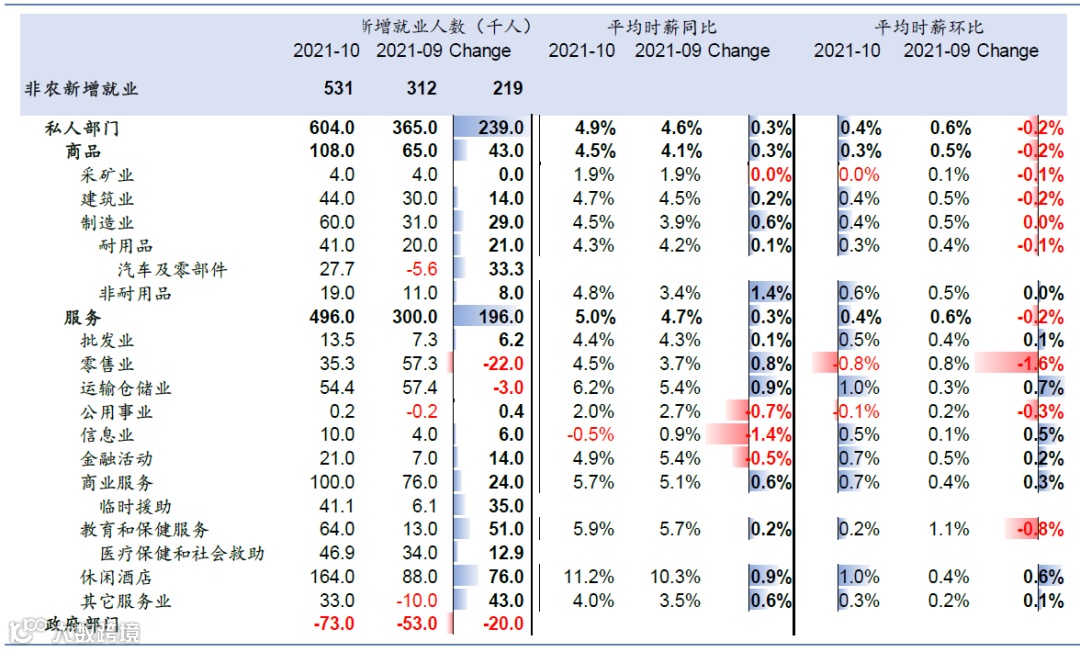 10月份,除教育行业以外、大部分行业就业人口皆上升,休闲酒店业最突出;服务业就业当月改善幅度大于商品生产。休闲和酒店业就业当月增加16.4万人,领跑各行业。批发零售(+4.9万人)、运输仓储(+5.4万人)、汽车制造业(+2.8万人)等物流和工业关键行业也有所改善,有助于缓解“供给瓶颈”。教育就业表现低迷,地方教育就业-4.3万人、州政府教育就业人-2.2万人、私立教育就业+1.7万人——美国劳工部指出教育行业招聘活动仍受疫情扰动。较2020年2月水平,服务业就业改善空间更大,休闲和酒店业就业仍低近140万人,地方+州政府+私立教育就业仍低72万人。