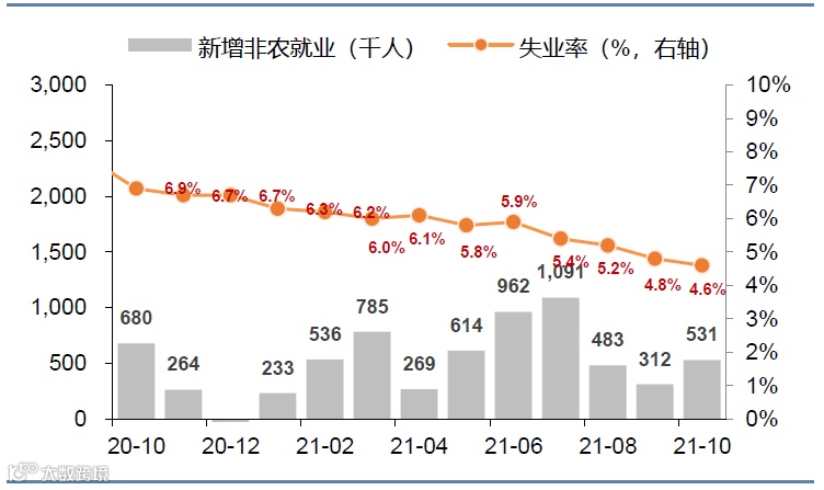 美国10月新增非农就业+53.1万人(季调后),好于彭博一致预期的+45万人;8月、9月值分别上调到+48.3万、+31.2万人。10月非农就业增长重新加快、薪资继续走高,服务业就业及薪资改善幅度均大于商品生产行业。当前就业市场面临的最主要问题是有工作意愿的民众人数——即劳动参与率——仍较低。自11月4日FOMC议息taper靴子落地以来,10年期美债利率由1.6%持续下行,非农数据公布后,从1.53%回落至1.47%。
