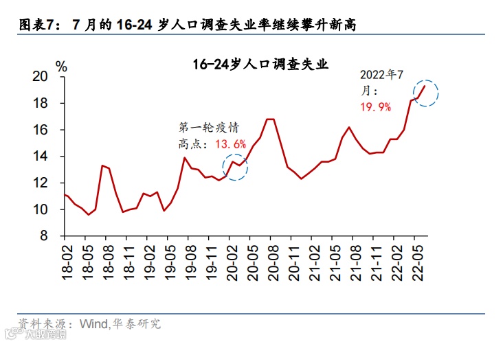 7月城镇调查失业率微降至5.4%,但年轻人失业率继续攀升新高——7月全国城镇调查失业率为5.4%,比上月下行0.1个百分点。但是,16-24岁失业率攀升至19.9%,明显高于去年7-8月季节性高点16.2%和2020年同期的16.8%(图表7)。