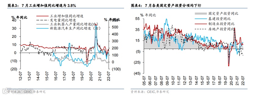 工业:2022年7月工业增加值同比增速从6月的3.9%下行至3.8%,显著低于Wind一致预期4.6%。7月工业增加值月环比折年增长4.7%。