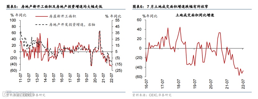 1)断供风波可视为地产需求再度下行的拐点,房地产基本面继续快速恶化。7月房地产开发投资同比增速从上月的-9.7%下降至-12.1%、地产销售持续下行,土地成交跌幅有所缩窄,但持续性仍有待观察。投资端,7月房地产新开工面积同比增速从6月的-45.1%继续下滑至-45.4%(图表5),在建面积同比增速为-3.7%,较上月的-2.8%下滑,完工面积同比增速从上月的-40.7%小幅上升至-36.0%,“保交楼”任务仍然艰巨。销售端,房地产销售面积和销售金额同比分别下降28.9%和28.2%,较6月的20.8%和18.3%再度下行,证明6月房地产销售数据的改善可能受疫后集中购房等一次性因素提振。高频数据显示8月商品房销售继续走弱——8月1-12日60城新房销售面积同比-36%(7月同口径-34%),且一二三线城市成交增速普遍下滑,绝对规模回落至4月水平。开发商现金流状况继续紧张,7月开发商资金来源同比增速为-26.0%,对比6月的-23.4%;分项中销售回款、按揭贷款及自筹资金(包括股权和债权融资)同比增速均下滑。土地成交略微改善,7月土地购置面积和土地成交价款同比增速分别为-47.3%和-33.4%,较6月的-52.8%和-65.1%跌幅有所收窄(图表6)。
