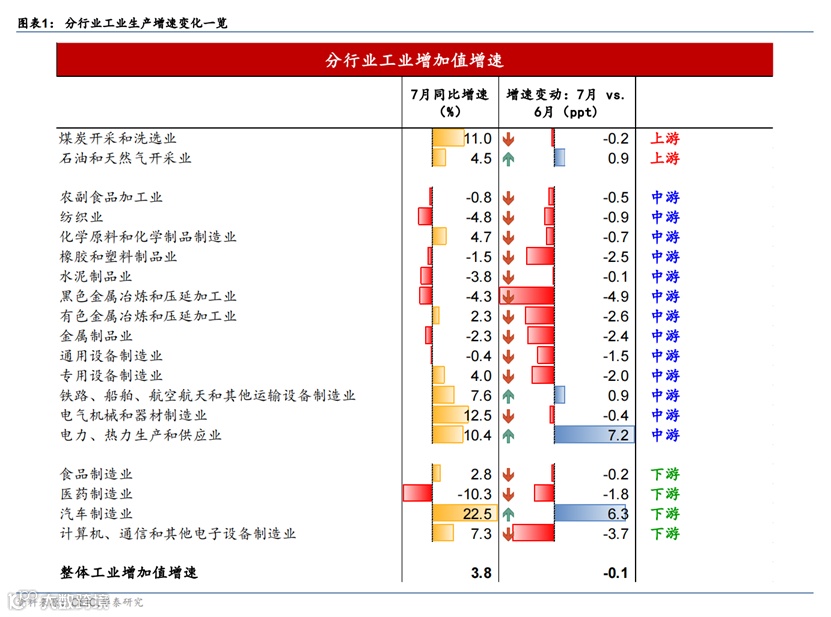 大部分行业生产增速均走弱,但受新能源车需求旺盛拉动、汽车制造增长仍然逆势上行,此外,此前需求较为旺盛的出口相关行业也初现减速态势。7月钢铁生产同比下滑4.3%、比6月下降4.9个百分点,且煤炭、化学、有色等行业生产增速均较6月放缓。此外,中游的通用设备、专用设备和电气机械行业增速分别为-0.4%/4.0%/12.5%,较上月下降1.5/2.0/0.4个百分点。产量上,7月钢材、玻璃、煤炭等工业原材料产量增速均走弱,工业机器人、机床、集成电路的产量增幅分别较6月下降11.3、3.1和6.2个百分点。汽车制造“一枝独秀”,7月汽车制造业增速进一步加快至22.5%,比6月上升6.3个百分点,同时汽车产量同比增速从6月的26.8%持续上升至31.5%,其中新能源汽车产量同比增长113%,贡献汽车产量增速17.8个点。由于天气炎热,7月发电量同比增长4.5%,比上月提高3个百分点(图表1和3);用电量数据显示居民用电同比大幅增长26.8%,贡献用电量增长近4个百分点。此外,第二产业用电量同比下滑0.1%。去除汽车及用电增长以外,7月工业生产降速更明显。