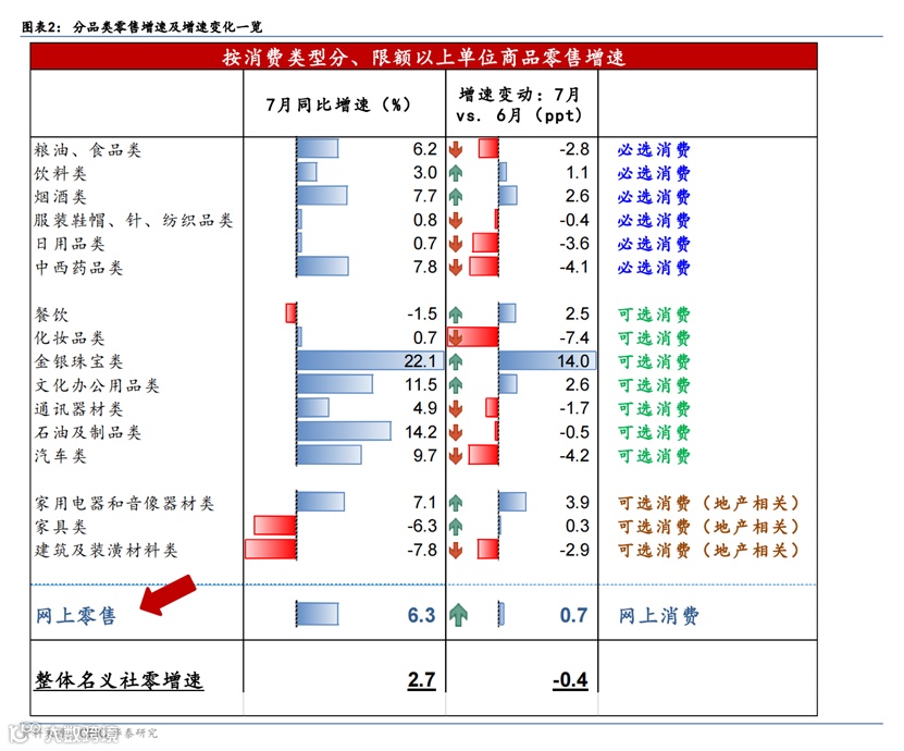 消费:7月消费增速未能延续复苏态势,社会消费品零售总额名义同比增速从6月的3.1%回落至2.7%,显著低于Wind一致预期5.3%。季节调整后,7月消费环比折年增长3.3%。可选消费和必选消费双双走弱,食品消费同比增长6.2%,比上月降低2.8个百分点,日用品、服装等消费增速亦有所放缓。在可选消费品类中,除金银珠宝消费加快外,化妆品、手机、汽车等消费增速普遍放缓,其中汽车零售增速从6月的13.9%回落至9.7%。地产相关消费受地产周期下行、地产成交放缓的拖累开始加大,虽然家用电器零售增速仍有7.1%,但家具零售增速为-6.3%,而建筑建材零售增速大幅下滑至-7.8%。另一方面,7月餐饮消费有所恢复、但并不强劲,更无“报复性消费”势头——同比增速仅从6月的-4%上升至-1.5%(图表2)。线上消费增速仍较为疲弱,7月网购增速从6月的5.6%小幅上行至6.3%。