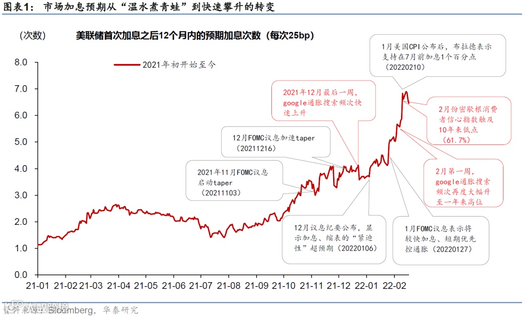 今年年初以来,美联储政策加速转向鹰派、逐渐成为市场焦点。简单回溯——去年11月FOMC议息美联储正式宣布启动削减QE(tapering, 2021年11月3日);在一个月之后的12月议息就宣布削减速度加倍;(12月16日);而今年1月6日发布的去年12月议息会议纪要,更是再度加固了联储的鹰派形象,字里行间透露出对通胀“失锚”的担忧,对加息表述更为鹰派、甚至首提缩表(quotative tightening,QT),超出市场预期(请参见20220112《12月FOMC纪要缘何引致轩然大波》)。随着这一系列“鹰派”的表态,市场对联储加息、甚至缩表的预期快速升温(图表1)。