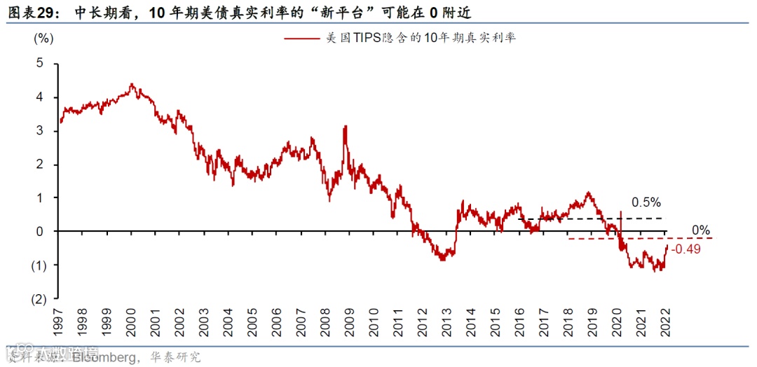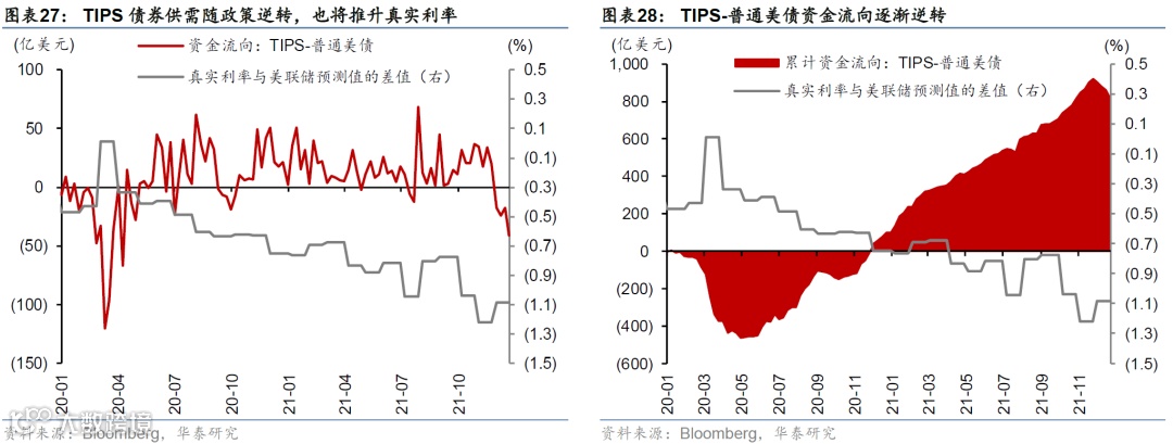 由于短期紧缩压低长期通胀预期,美债长端真实利率上升可能比名义利率更快。一般来说,真实利率走势受名义利率、通胀预期以及TIPS供需三个方面的影响。目前看,三个因素均指向真实利率上行。从基本面角度看,美联储加息预期升温会推升名义利率、并压制长期通胀预期。特别地,美联储收紧节奏越快、越前置,对长期通胀预期的压制作用可能越明显,甚至短端通胀预期上行本身就会压低长期通胀预期。从技术面角度看,疫后美联储实施的无限量化宽松政策、尤其是大规模购买TIPS国债的行为,人为压低真实利率,导致10年期TIPS美债收益率维持在-1%左右的低位(图表26)。2020年3月以来,流入TIPS美债的资金持续高于普通美债,带动TIPS利率明显低于美联储的预测值(图表27和28)。随着美联储逐渐退出量化宽松,对TIPS美债需求下降可能反过来会推升TIPS收益率。综合来看,短期内长端真实利率上行可能会快于名义利率。中长期看,10年期美债真实利率的“新平台”可能在0附近,低于疫情前0.5%左右的水平(图表29)。