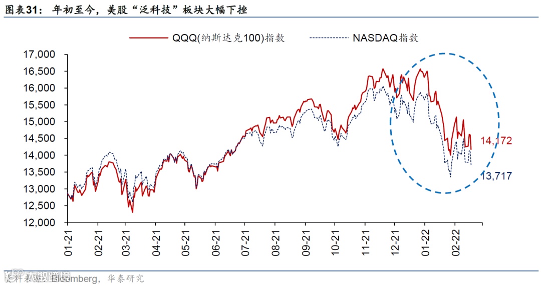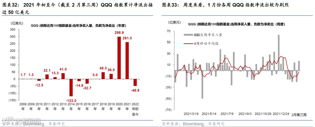 真实利率快速上行过程中,利率敏感的美股板块遭遇较大规模的净卖出。年初至今(截至2月18日),美国此前累积流入最多、但估值对利率最敏感的“泛科技”板块大幅下挫——QQQ(纳斯达克100)指数回撤13.2%,NASDAQ指数下行12.3%,标普500指数回撤8.1%(图表31)。值得注意的是,美股泛科技板块2020-2021年累积了“前所未有”的净流入量——QQQ指数在2020和2021年分别达到299亿和261亿美元的净流入,是2018-19年平均流入的6-7倍,而2021年初至今(截至2月第三周)已累计净流出接近50亿美元(图表32-33),这可以解释年初以来美股、尤其是纳斯达克/QQQ等股指的大幅回撤。
