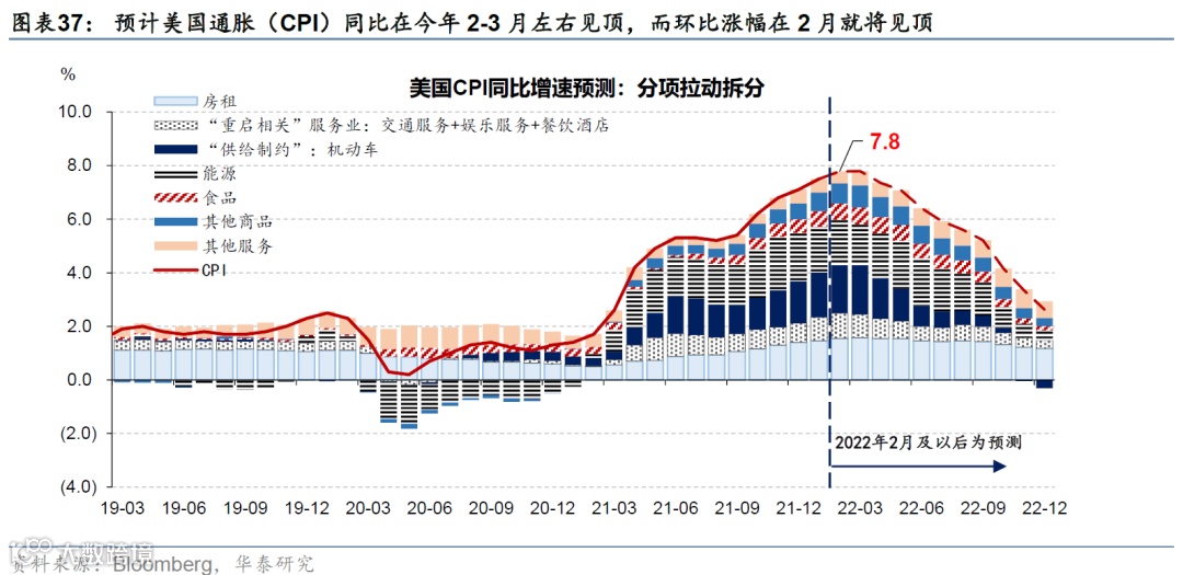 如我们在20220112《12月FOMC纪要缘何引致轩然大波》中所述,我们预期通胀指标可能在今年一季度末左右开始回落——一方面,进入2月以来,欧美主要经济体疫情加快缓和,多国已全面放松疫情管控、全球经济从O株影响中恢复的速度或快于去年夏季的Delta疫情;我们中性预计今年二季度,全球服务业、以及人员跨境流动将再度全面重启,供应链冲击及滞胀压力有望减弱。另一方面,美联储目前参考的通胀模型纳入了较多可贸易品,按此前一般规律,中国周期大幅减速的影响或在今年1-2季度之间传导至全球贸易和可贸易品价格(回落)上。全球周期减速、可贸易品价格开始转向,有望压低联储通胀预测模型中的“高通胀”概率。综合考量,通胀预期难以持续加速上行,我们中性预计美国CPI、核心PCE等通胀指标(同比)将在今年2-3月见顶(以3月CPI数据为例,将在4月上旬公布)(图表37)。