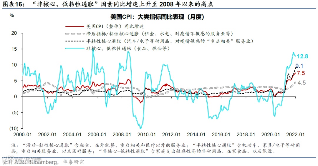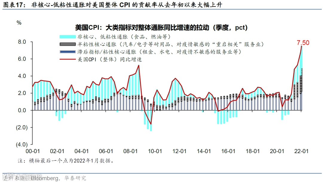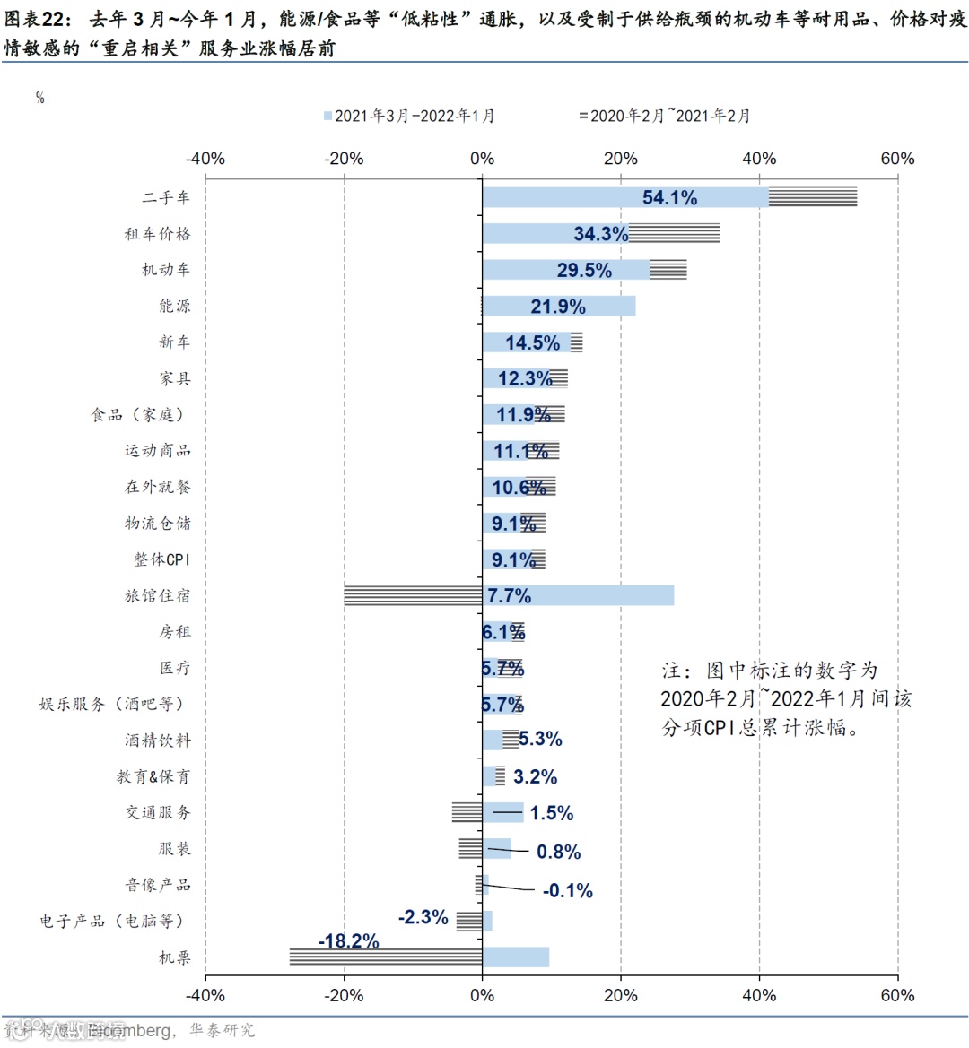 从2021年3月~2022年1月间(2021年3月是去年第一轮疫苗接种推广、疫情缓和的节点),美国CPI当中涨幅最大的分项是二手车(41.4%),以下依次为机动车(24.3%)、能源(22.1%)、家具(9.7%)、机票(9.7%)、家庭食品(7.5%)、整体CPI(7.1%)、房屋租金(4.3%)、医疗服务(2.2%)、电子产品(1.4%)等。能源和食品价格等“低粘性”通胀因素,以及受制于供给瓶颈的机动车等耐用品,价格对疫情敏感的“重启相关”服务业涨幅居前(图表22)。