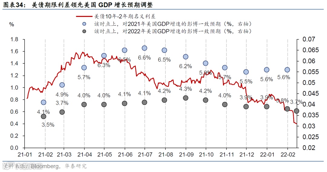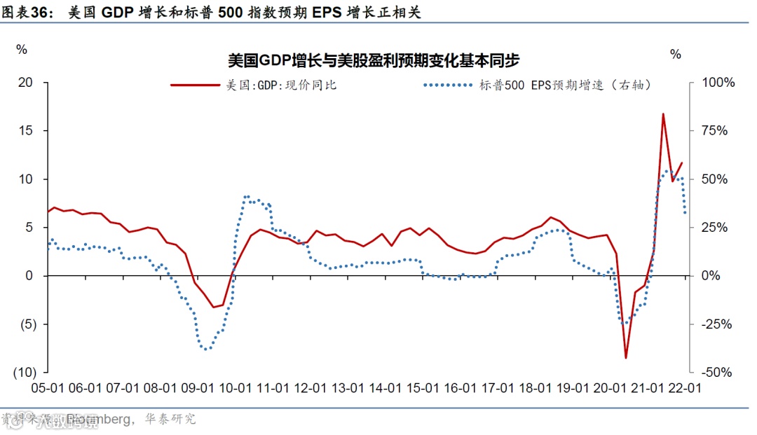 同时,利率曲线“扁平化”往往意味着增长预期下调,可能同时利空“价值蓝筹”板块——如图表34-35所示,美债长短端期限利差对于GDP增长、及市场对GDP增速的预期有一定领先性。期限利差收窄、利率曲线走平隐含短端利率较长端利率上行更快,通常意味着货币政策和金融条件收紧(例如较快加息),短端利率跟随基准利率上行,而长端增长和通胀预期则受到压制。2021下半年以来,市场对2021及2022年美国GDP增长的一致预期值已经多次下调;而一些偏价值蓝筹、大盘股也可能面临短期盈利预期下调的压力(图表36)。