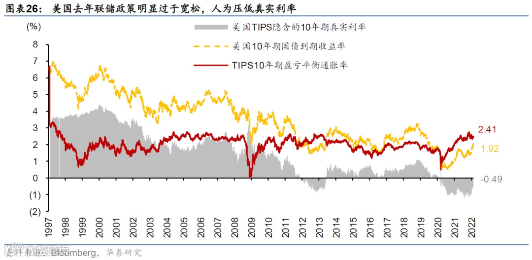 美债真实利率曲线扁平化的压力比名义利率曲线更大。由于市场此前对美联储政策预期较为鸽派,在短期通胀预期明显上行的情况下,短端名义利率仍维持低位,导致短端真实利率大幅低于长端,美债真实利率曲线处于历史上较为陡峭的水平。随着美联储转鹰,短期名义利率上行的同时,短期通胀预期也有望见顶回落,从而带动美债真实利率曲线快速扁平化(图表30)。分期限看,我们预计美债 30 年真实利率调整(上行)可能基本已经到位,10年真实利率可能继续上升 30 BP 左右,而5 年期真实利率可能还有 70-90BP 的上升空间。分解下来,美债10年期真实利率上行可能一半表现为通胀预期下行,另一半表现为名义利率上升,而越短端的真实利率上行当中、名义利率上升的份额越大,越长端则通胀预期下行贡献更大。由此,美债真实利率上升、且曲线扁平化,可能是短期的大概率事件。
