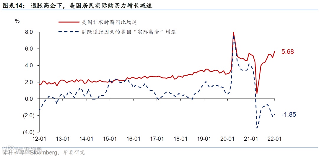 居民实际购买力水平下降——通胀高企+财政刺激退坡下,居民收入增长后续乏力,美国居民实际收入水平下滑、“由奢入俭难”,加剧通胀的“政治压力”。一方面,通胀本身的“水位”越来越高,另一方面,随着美国政府的财政补贴开始“退坡”(拜登政府去年3月份的1.9万亿美元财政刺激包含较大体量的直接转移支付、去年二三季度已完成主要发放,一度大幅拉升美国居民收入水平),美国居民收入增长后续乏力(如图13所示),2021下半年,收入增速中枢明显低于财政刺激投放期间。两项叠加下,美国居民实际购买力增长大幅减速——尽管劳工市场较为紧张、名义薪资水平持续上涨,今年1月,非农薪资同比仍有5.7%的增速,但剔除通胀因素(CPI衡量)后,“实际”的薪资增长、即购买力水平变化,从去年4月开始即转入同比负增区间,今年1月同比增速为-1.9%(如图14所示)。