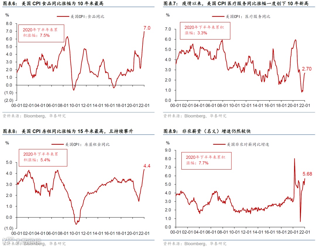 今年1月,美国CPI攀升至同比7.5%;2021年12月份核心PCE同比4.9%,两者均为近40年来高点。而继去年机动车、能源、及重启相关服务业录得相当大的涨幅之后(图表3至9),今年美国普通民众生活“必需品”的价格、如新鲜食品、医疗服务等,也一涨再涨(图表3-9)。同时,通胀“粘性”也不容小觑,“粘性通胀”的代表性指标,租金和劳工价格,涨势升至数十年来最高水平。
