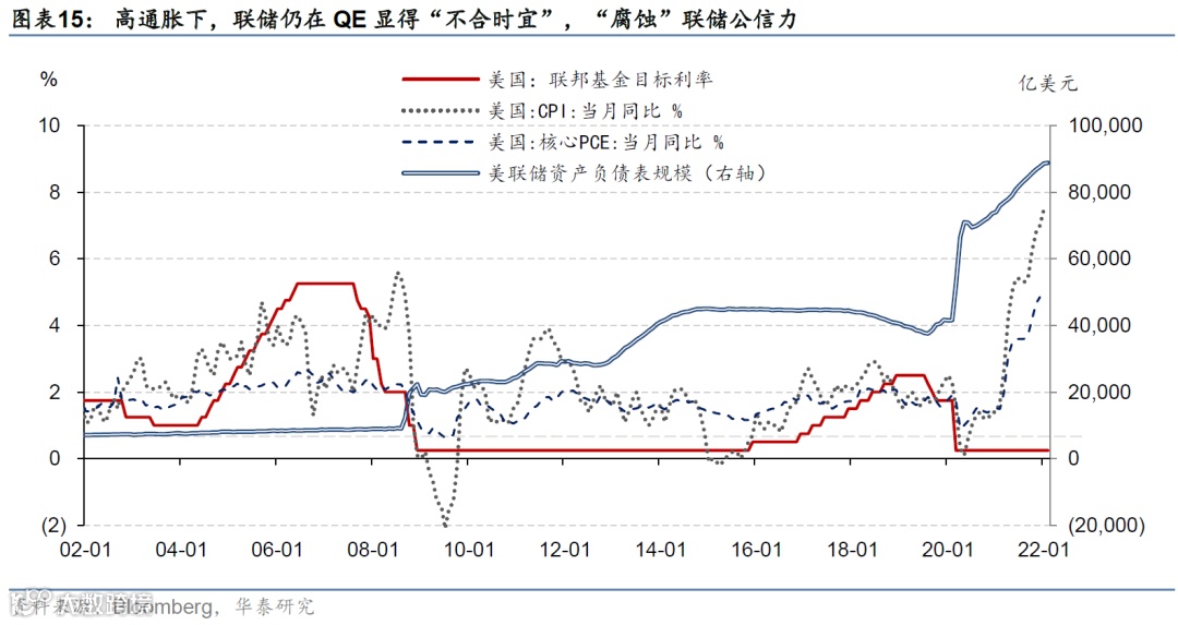 其次,当通胀成为最大的“政治”,短期内联储政策收紧可能会比市场预期更快、政策“前置”。全年来看,今年上半年政策收紧的速度或快于下半年。——从技术层面看,在目前的高通胀下,联储资产负债表规模仍处于历史高位、而基准利率仍在历史低位,显然“不合时宜”,如图15所示。为重塑政策“公信力”,联储需要加速停止QE、并尽快加息;可能直到通胀指标开始回落,甚至经济出现明显走弱的迹象,联储政策才可能边际再转回“中性”。