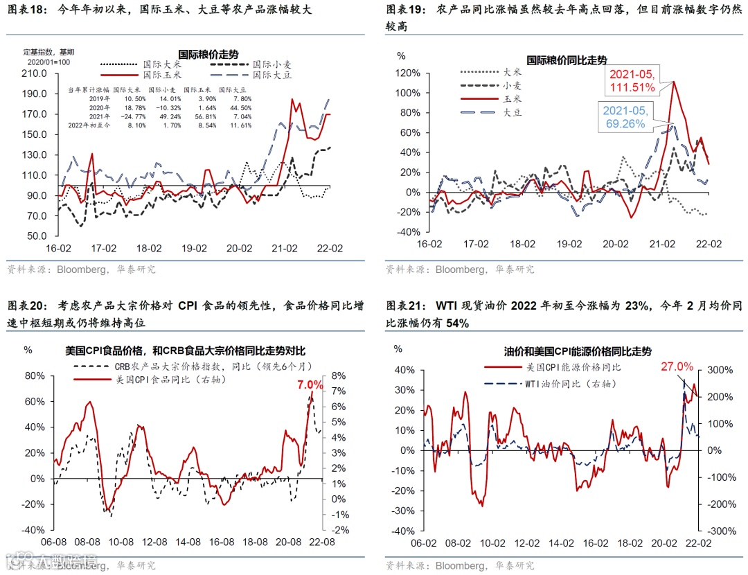 今年年初以来,国际农产品、原油价格上涨有“愈演愈烈”的趋势——美洲地区定价的玉米、大豆等农产品,以及受地缘政治和供给因素影响的国际油价涨幅较大。诸如俄罗斯-乌克兰地缘冲突等不确定性因素,可能进一步加大相关大宗产品价格的不确定性。国际农产品价格、尤其是美洲地区主产的玉米、大豆、小麦等价格,均已达到或接近10年来的高位(图表18),去年三季度一度有所回调、但四季度至今重新上涨。原油价格则迅速“摆脱”O毒株带来的情绪冲击,年初以来快速回弹、接近100美元/桶,为2014年以来高点。同比角度,国际农产品及原油价格同比涨幅虽然较去年高点回落,但目前涨幅(绝对)幅度仍然处于高位(图表19)。