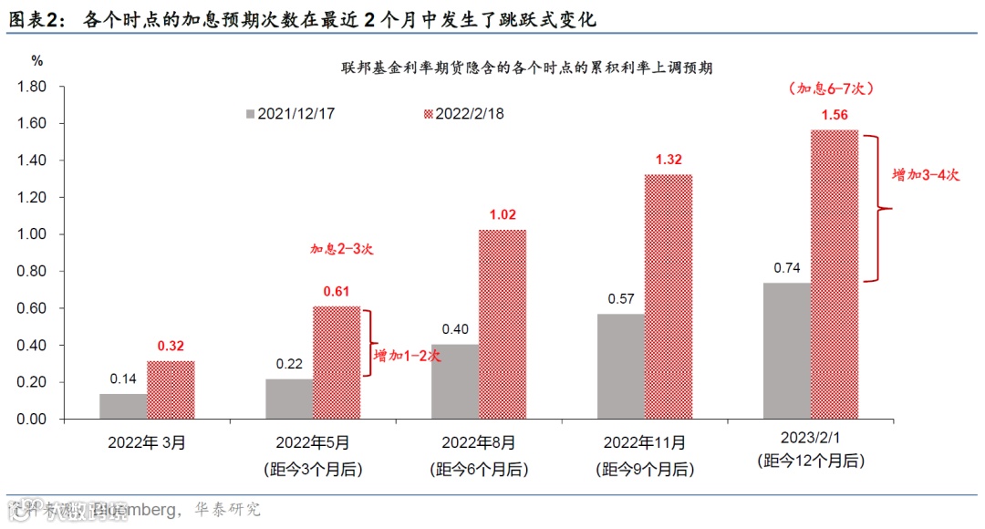 在1月27日的FOMC议息会议上,联储再次比市场预期更为鹰派,明确表示“致力于价格稳定目标”(committed to price stability),预计很快就将加息(soon be appropriate),可能将在加息开始后不久就着手缩表(will occur after raising interest rates has begun)(参见20220127《1月FOMC:3月加息、缩表随后》)。而在2月10日美国1月CPI数据发布后(同比攀升至7.5%),联储官员布拉德更是向市场表态,不排除一次性加息50个基点、今年上半年累计加息1个百分点的可能性(据彭博报道:https://www.bloomberg.com/news/articles/2022-02-10/fed-s-bullard-backs-supersized-hike-seeks-full-point-by-july-1)。话音刚落,市场加息预期再次上调——参见我们2月11日发布的《CPI再超预期,联储短期偏紧立场不变》。