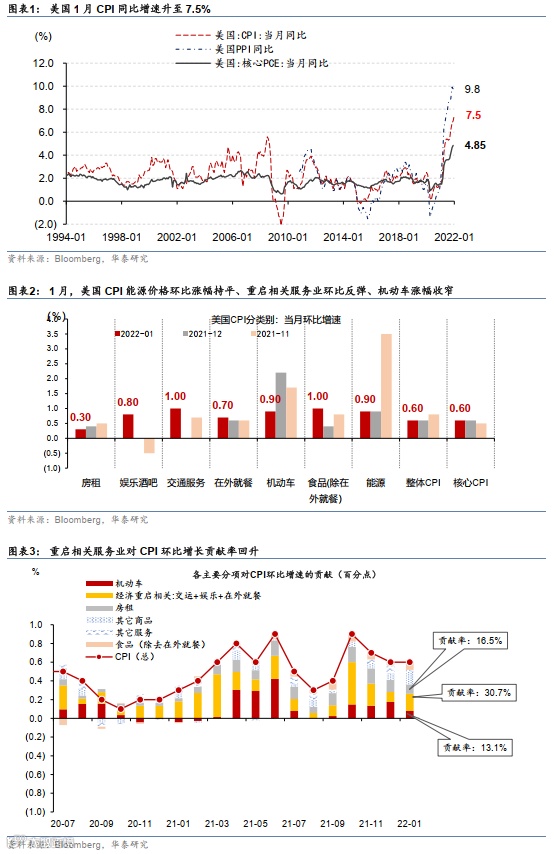美国1月CPI环比+0.6%,涨幅超预期(彭博一致预期0.4%,前值0.6%)、同比增速升至7.5%(前值7%);核心CPI环比+0.6%(彭博一致预期0.5%,前值0.6%),同比增速升至+6%(前值5.5%)。数据公布后(截至北京时间2月11日9:00),美国10年期国债收益率从1.94%左右上行、突破2%,而市场对美联储3月加息幅度的“定价”再度大幅上行。