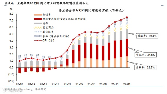 1月份,重启相关商品和服务业价格回升;机动车涨幅收窄,房租环比涨幅连续两个月小幅回落;能源价格环比涨幅持平前值;家具、电子产品等涨幅小幅扩大。环比来看,能源价格涨0.9%、持平前值。CPI交通服务(环比1%,前值零增长)反弹,修车和车险价格反弹,机票价格(环比2.3%,前值2.5%)环比较前值差别不大。综合来看,重启相关价格(服务业+能源)环比涨0.9%、前值0.5%。机动车价格环比涨0.9%、前值2.2%,新车及二手车价格涨幅均收窄。房租价格环比涨0.3%,较前值小幅回落0.1pct。1月份,交通服务、娱乐服务、在外就餐和能源对整体CPI加总环比贡献率回升到30.7%(前值17.6%);机动车回落到13.1%(前值29.2%)。