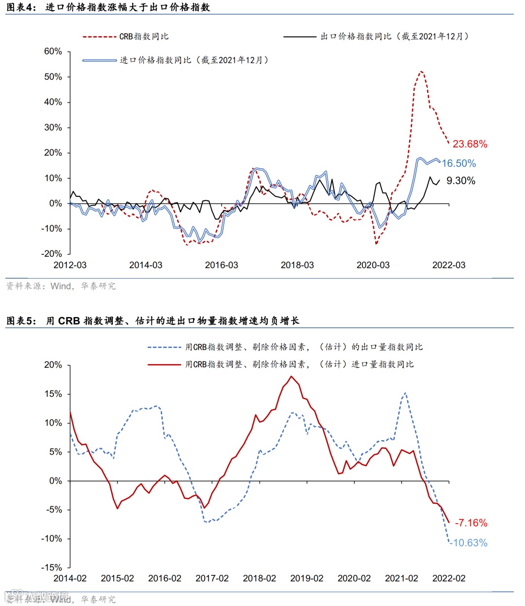 美元计价,1-2月我国进口同比+15.5%,低于预期(wind一致预期+16.8%,前值+19.5%);目前海关公布进口价格和物量指数截止到去年12月、同比分别为16.5%和-0.4%。若以此进口价格增速对1-2月进口金额作调整,1-2月的“实际”进口量增速可能在零增长附近;若用CRB指数(截至今年3月)调整、消除价格因素,(估计的)1-2月进口物量指数环比折年率-9.3%,同比跌幅-7.2%。