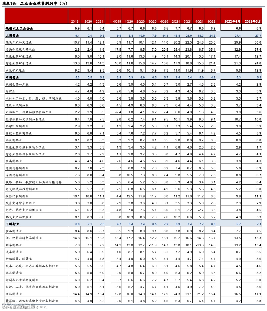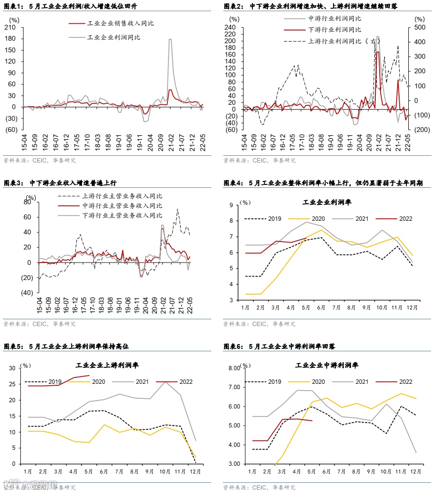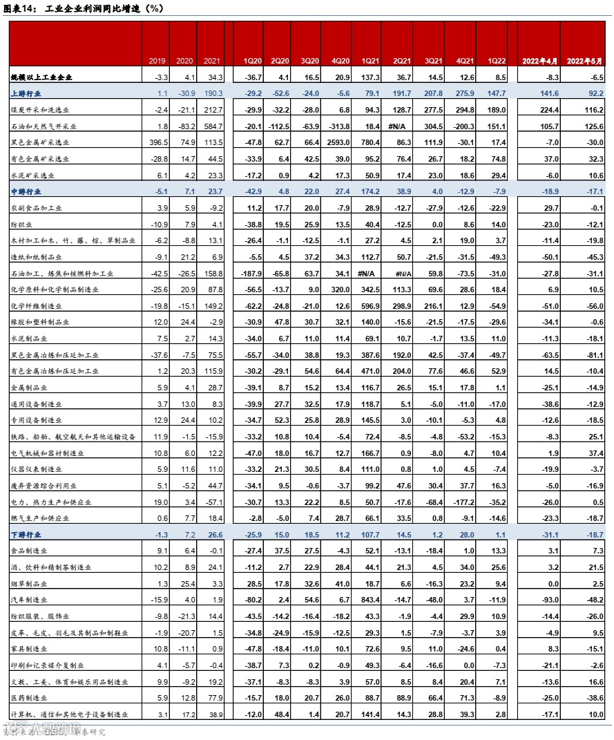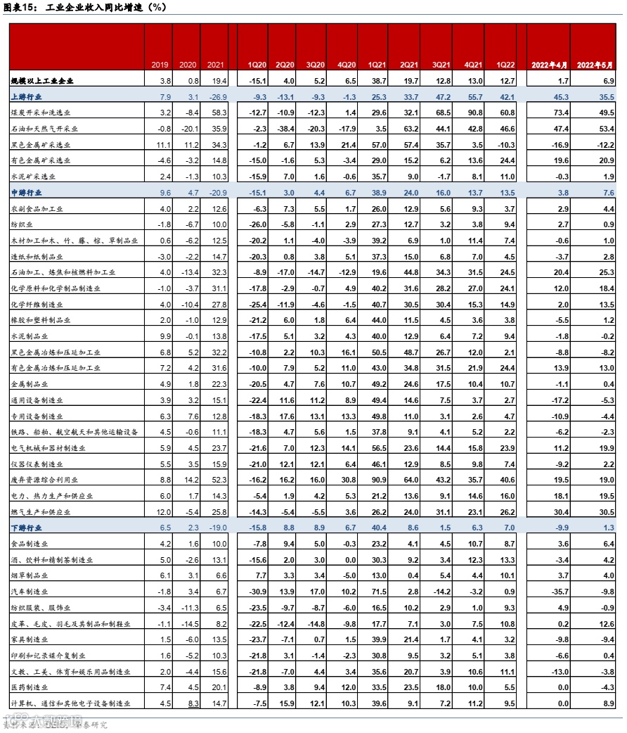 2022年5月工业企业利润同比增速为-6.5%,降幅较上月收窄2.0个百分点,但距离一季度的8.5%仍有较大差距。5月营业收入增速为6.9%,较4月的1.7%显著回升,但仍低于2022年1季度的12.7%。中下游行业盈利增速低位反弹,中/下游行业5月盈利增速分别为-17.1%和-18.7%,对比4月的-18.9%和-31.1%;上游行业盈利增速仍然较高,维持在90%以上。收入方面,5月上/中/下游行业收入增速分别为35.5%/7.6%/1.3%,而4月为45.3%/3.8%/-9.9%(图表1-3),亦为中下游改善。