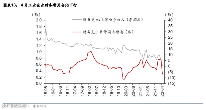 4月工业企业亏损额小幅上行。财务费用收入占比和流动资产比例均下行。(图表8,11及13,由于5月工业企业财务费用、流动资产和亏损额数据到目前为止仍然缺失,我们将在下月点评中一并更新)。