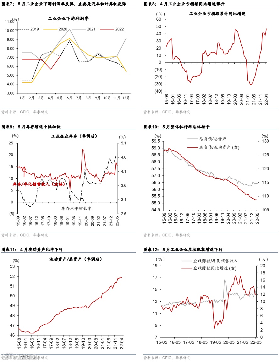 2)上海疫情改善、复工复产推进,其产业占比高的“高、精、尖”制造业盈利降幅明显收窄,包括汽车、设备制造、计算机等。5月中旬之后上海复工复产启动,叠加物流恢复,前期受疫情影响较大的制造业盈利和收入增速反弹,但尚未完全恢复至常态:5月汽车行业利润/营收同比增速为-48.2%/-9.8%,较4月的-93%/-35.7%跌幅明显收窄,但仍显著低于1季度的-11.9%/0.9%。此外,5月通用设备制造业盈利增速为-12.9%,计算机制造业盈利同比增速为10%,电气机械行业盈利增速为37.4%,相比4月增速分别回升25.7、27.1和35.5个百分点;此外,上述三个行业的5月收入增速分别为-5.3%、8.9%和19.9%,相比4月回升幅度为11.9、8.9和8.6个百分点。