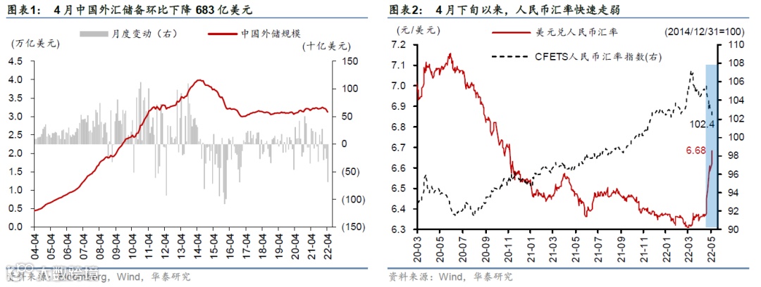 1)4月美元大幅走强明显拉低外储估值。随着美联储快速加息预期升温、且临近缩表,4月美元指数环比大幅上涨4.7%。分币种来看,由于美日货币政策取向持续背离,4月日元兑美元汇率大幅贬值6.2%,而欧元、英镑分别兑美元贬值4.7%、4.3%。据我们估算,4月非美元货币兑美元汇率变化可能导致以美元计的外储估值环比下跌约500亿美元。