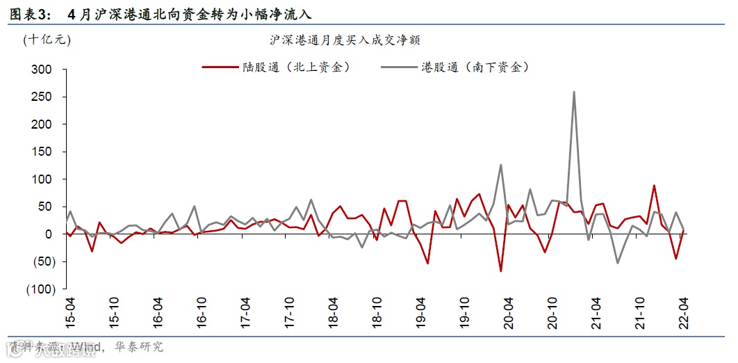 3)4月外汇流出压力可能边际上有所缓解。近期国内疫情及防控措施带来的相关不确定性上升,叠加美元走强,加剧人民币贬值压力。4月人民币兑美元汇率环比贬值3.7%,兑一篮子货币的CFETS人民币汇率指数下跌1.0%(图表2)。然而,内需走弱下,衰退性贸易顺差规模可能扩大;同时,在3月录得较大规模流出后,4月沪深港通北向资金重回净流入,显示人民币资产的中长期吸引力回升(图表3)。由此,4月外汇流出压力可能边际缓和。