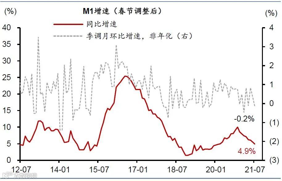 3) 7月M2同比增速从6月的8.6%回落至8.3%,明显低于彭博一致预期的8.7%(图表4)。经季节性调整后,7月M2月环比(非年化)增速从6月的0.9%降至0.4%。7月财政存款环比上升6,008亿元,增幅超过去年同期的4,872亿元,拖累M2增速约0.1个百分点。由此,7月财政存款同比增速从6月的19.8%微升至20.1%、维持高位。7月M1同比增速从6月的5.5%放缓至4.9%,环比(非年化)增速也从6月的0.3%回落至-0.2%,反映地产需求走弱、以及地方隐性负债监管收紧对企业现金流的影响(图表5)。