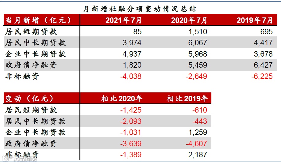 图表1:7月新增社融明显不及预期,主要由于新增居民贷款和企业中长期贷款与政府债净融资同比少增、以及非标融资同比多减