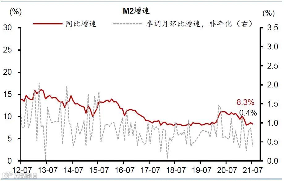 7月以来虽然降准,但对地产与地方隐性负债等监管收紧显然对社融放量产生明显压制。7月10日加强地方隐性债务监管的“15号文”出台,可能在一定程度上抑制企业及政府部门的融资需求,而行业相关监管政策可能会对股市融资产生影响。具体看,7月新增社融、人民币贷款与M2同比增速均明显低于市场预期——7月社融存量同比增速从6月的11.0%放缓至10.7%,而季调后月环比折年增速从6月的11.1%明显回落至9.1%(图表1和2)。7月新增社融为1.06万亿元,明显低于彭博一致预期的1.7万亿元。同时,7月M2同比增速从6月的8.6%降至8.3%,明显低于彭博一致预期的8.7%,M1同比增长也从6月的5.5%放缓至4.9%,低于彭博一致预期的5.5%。分项看,7月社融增速低于预期,主要由于新增居民贷款和企业中长期贷款与政府债净融资同比少增、以及非标融资同比多减,反映地方隐性负债监管进一步收紧的“阵痛”,同时地产调控层层叠加、最终在需求端产生从量变到质变的影响。此外,财政存款增速维持高位,也在一定程度上拖累M2增长。