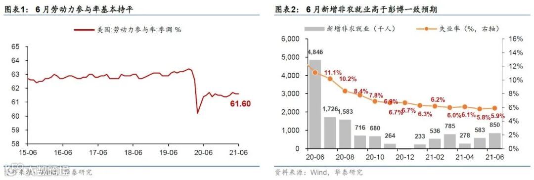 美国6月份劳动参与率61.6%、持平前值;失业率5.9%,较前值上升0.1个百分点(彭博一致预期+5.6%)。失业补贴逐步退出之下,求职意愿略有回升,失业人口略有上升、就业人口持平,可能由于岗位能力不匹配、薪资期望过高等因素,劳动力市场摩擦性失业依然存在。今年三季度,就业市场“供给不足”问题有望逐渐缓解、供需更加平衡,但劳动参与率和失业率距离联储的“合意水平”尚有差距——疫情前两者分别在63%和3.7%左右。