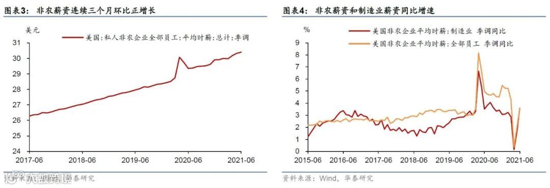 美国6月非农时薪环比+0.3%,连续三个月环比正增长;6月时薪较2020年1月值(疫情爆发前)累计增长近7%。如我们在《海外:通胀与利率的平衡依然“脆弱”》(20210531)中所述,尽管财政补贴发放、美国居民消费环比改善幅度最大时点或已过去,但财政补贴造成居民对薪资期望水平更高的影响效应仍未消退,而就业市场短期的供不应求也推动薪资水平增长。房租、薪资等更具“粘性”的通胀因素使得核心通胀上行更具持续性。