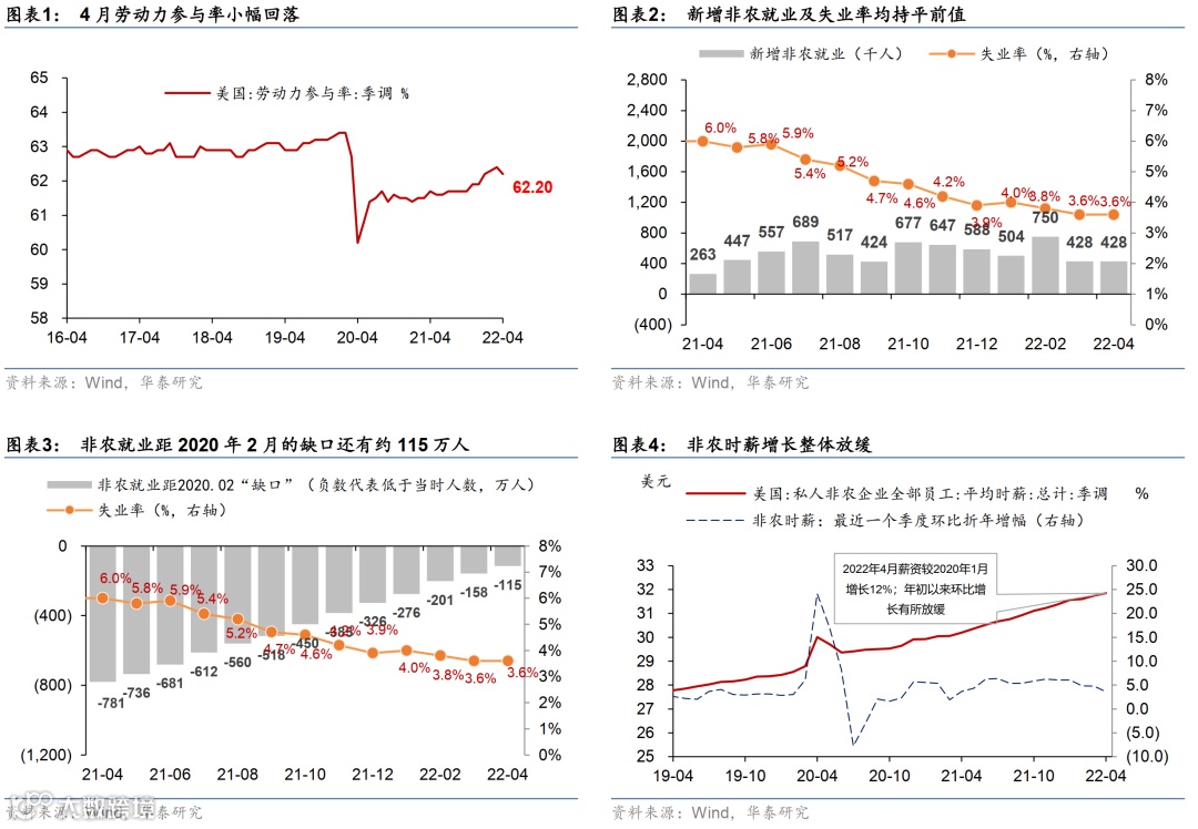 美国4月新增非农就业+42.8万人(季调后)、持平前值,略好于彭博一致预期的+38万人;非农就业(季调后)距离2020年2月的“缺口”仍有115万人。服务业就业岗位增长强劲,薪资水平继续上涨,劳工市场依然紧张,联储短期内继续快速加息的预期仍然巩固。