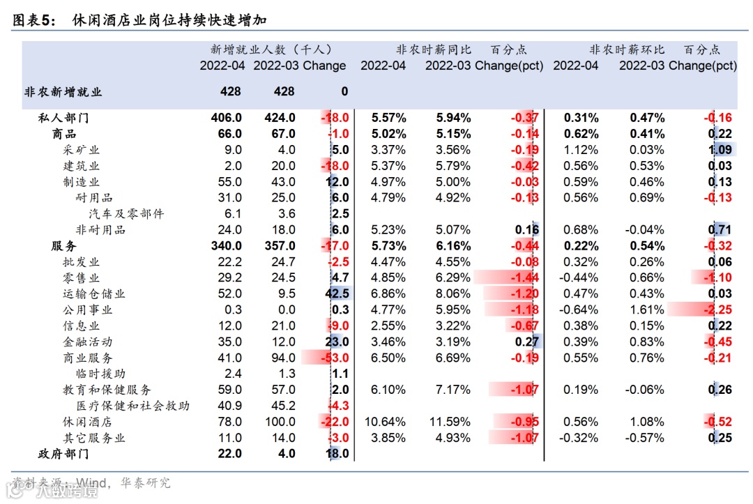 4月非农时薪环比较前值上涨0.3%、略低于彭博一致预期的0.4%(前值0.5%)。劳动力市场仍然“供不应求”、薪资水平仍在继续上涨,但年初以来上涨速率稍有缓和,难以“跑赢”当前的通胀。去年Q1~今年Q1,非农时薪环比折年增速依次为1.9%、6.3%、5.4%、6.1%、4.8%,今年4月份相对于1月、最近3个月的折年增速则放缓到3.6%。4月份,薪资环比涨幅最大的服务行业仍然是休闲酒店业(环比0.6%);零售业(-1.1pct)、公用事业(-2.3pct)薪资环比增速较前值放缓幅度最大。