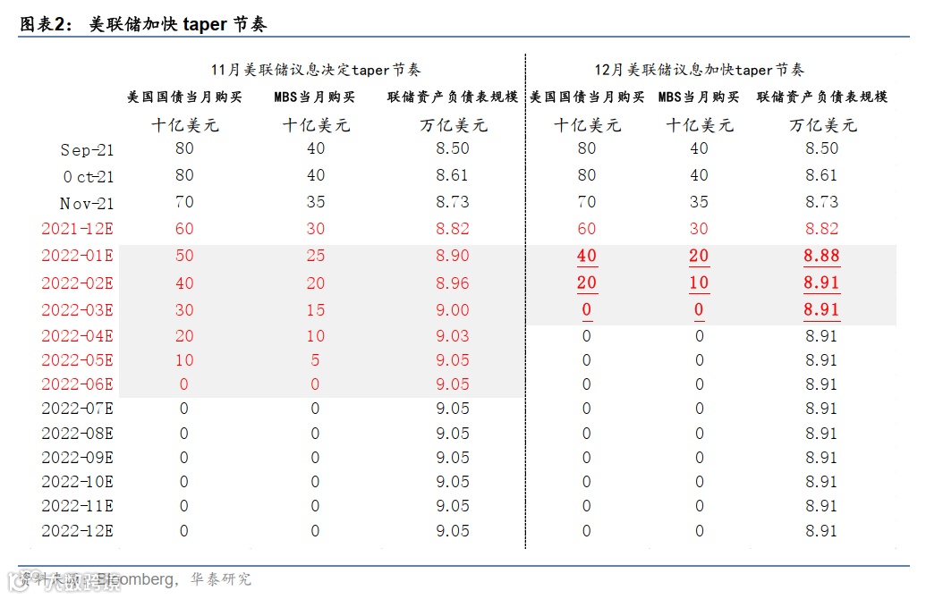 北京时间12月16日(周四)凌晨,美联储公布12月议息决议,如期修正通胀(预测)、去除了对通胀判断为“暂时性”的表述,并加快taper节奏——三项关键调整均符合市场预期。美联储将每个月的削减力度进一步加大到300亿美元,即每个月减少200亿美元的国债购买、100亿美元的MBS购买——如我们在20211214《联储或加速taper,意在回归中性立场》中所预期。以此推算,QE削减将“提前”一个季度于2022年3月完成,美联储资产负债表峰值将在8.9万亿美元左右(参见图表2)。议息决议公布后,美债10年期利率小幅震荡,仍继续收于1.45%左右;美元指数从96.8回落到96.3;黄金现货价格小幅上涨(截至北京时间12月16日8:00)。