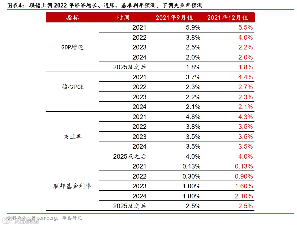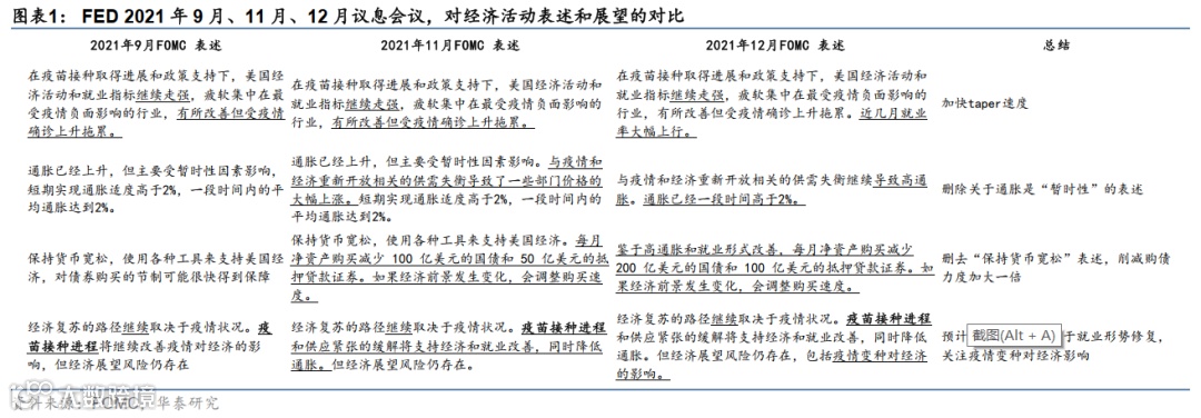 此外,如我们预计,美联储本次议息修正通胀表述,认为供需失衡推动通胀的影响大于预期(larger and longer lasting than anticipated),承认通胀可能更具“持续性”(persistent)。如我们在20211214《联储或加速taper,意在回归中性立场》中所述,通胀表述修正、taper节奏加快,显示美联储在承认此前“误判”后,加速回归更为中性的货币政策立场、预留更大的政策空间(…better position policy to address the full range of plausible economic outcomes),但不代表将全面“转鹰”、立刻启动“紧缩”模式。
