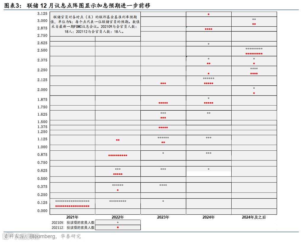 12月FOMC点阵图显示加息预期再度前移(图表3)。所有联储官员认为2022年内将首次加息、中位数预期明年加息3次(10/18人),而9月议息只有一半的官员认为明年将(至少有一次)加息。对于2023年加息预期,中位数预期上移至“2023年底前加息6次”,即明年和后年各加息3次。