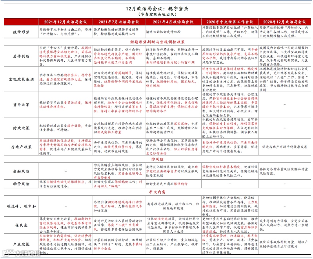 3)房地产政策:本次12月政治局会议未提“房住不炒”,并提出保证合理住房需求——这可能包括落户、升级、和保障性多层次需求。这是自去年中央经济工作会议、今年4月及7月政治局会议之后首次如此。在房地产领域,政策强调要推进保障性住房建设,支持商品房市场更好满足购房者的合理住房需求,促进房地产业健康发展和良性循环。这意味着,房地产行业化解风险的重要性将上升,同时保障性住房将成为提振地产需求、稳定增长的“破局”之策(参见我们2021年11月11日发布的报告《宏观政策如何(部分)对冲地产拖累?》)。
