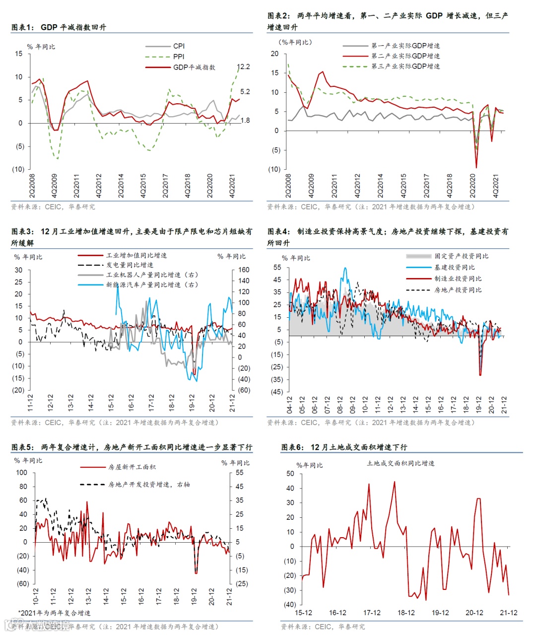 2021年4季度实际GDP增速从3季度的4.9%放缓至4.0%,主要是由于高基数,高于Wind市场一致预期3.8%。实际GDP两年复合增长5.2%,高于3季度的4.9%;环比增速从3季度的0.7%反弹至1.6%(折年后约6.6%)。4季度名义GDP同比增速从3季度的9.8%下降至9.4%,两年同比增速则回升至8.2%。此外,GDP平减指数从3季度的4.7%回升至5.2%(图表1),4季度PPI和CPI分别上升至12.2%和1.8%,推升GDP平减指数。分产业看,4季度一产、二产和三产的两年实际GDP复合增速分别为5.2%/4.6%/5.6%,对比3季度的5.5%/4.8%/4.8%(图表2)。