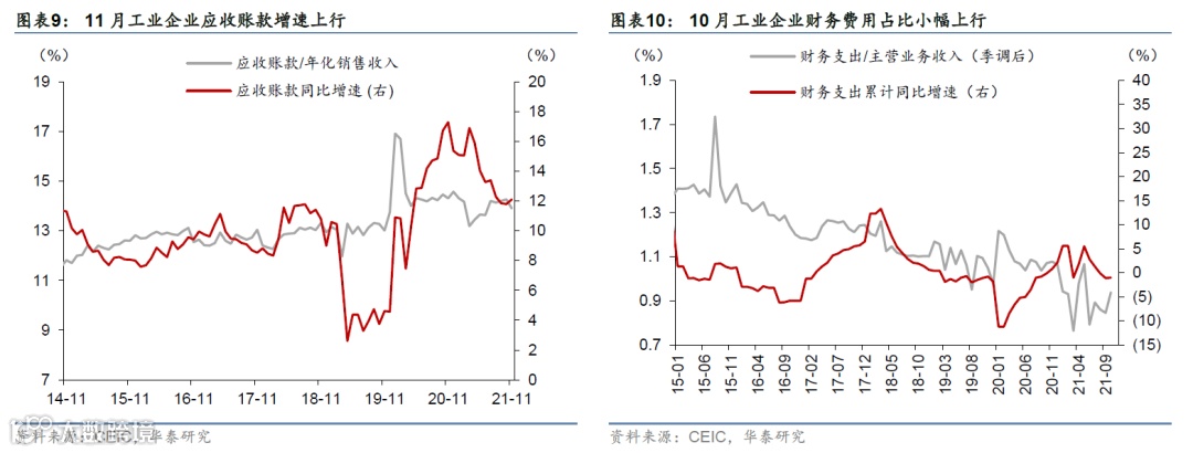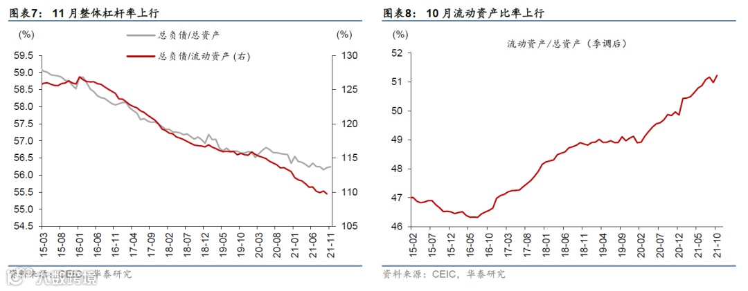 11月工业品库存小幅上行,总体现金流有所改善。库存同比增速持续上行但库销比下行。整体杠杆率基本小幅上行,应收账款增速继续上行但应收账款(与销售收入)比率下行(图表6-9)。